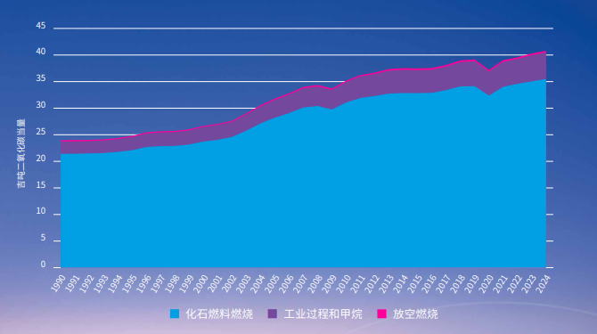 2024年,石油、天然气、煤炭、核能、水电和可再生能源的需求(即所有形式的能源需求)均有所增长,上次出现这种情况还是在2006年。可再生能源(水电除外)仍然是增长最快的能源(增长9%),其次是水电(增长4%)和核能(增长3%)。化石燃料方面,天然气的增幅最大,为2.5%;其次是煤炭,增幅为1%;石油仅小幅增长0.6%。石油仍然是主要能源,满足了34%的总能源需求。2024年碳排放量增加了1%,超过前一年创下的40.8吉吨二氧化碳当量的纪录。化石燃料燃烧产生的二氧化碳排放是迄今为止能源相关温室气体排放的最大来源,占总排放量的87%。
