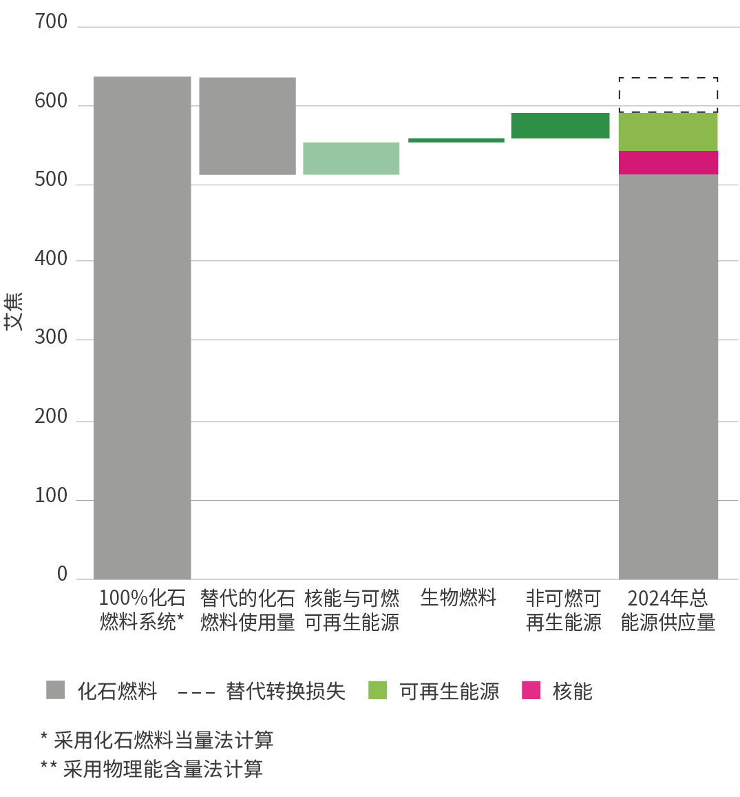 自2010年以来,通过利用可再生能源和核能,全球替代使用1,371艾焦化石燃料减少排放109吉吨温室气体。随着各国致力于能源系统脱碳,以应对气候变化的影响,能源格局发生了重大变化。在过去五年里,可再生能源的平均增长率与全球总能源需求年平均增长率的比率上升到了五倍以上。因此,鉴于可再生能源对人类日常生活的贡献越来越大,从2025年开始,报告修改了衡量能源总需求的方式。以前,全球几乎完全以石油、天然气和煤炭为燃料,使用化石燃料当量(或置换)方法计算一次能源消费是合理的,但这种方法不再适用于当今的能源系统。今年,报告采用了物理能量含量法来反映总能源供应量(这个指标衡量一国为满足其最终使用需求而需要供应的能源总量)。