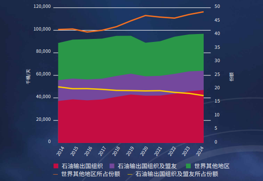 2024年,全球石油产量增长0.6%,至9,700万桶/日,非石油输出国组织国家为主要增长驱动因素。其中,美国增长最为强劲,产量创下新高,首次突破2千万桶/日的水平,这得益于其页岩开采技术和运营效率的提高。南美洲石油产国,特别是圭亚那和阿根廷,也出现了显著增长。随着中国向电动汽车和液化天然气卡车的迅速过渡,石油需求进一步下降。然而,印度和东南亚的增长在一定程度上抵消了此需求下降。空中出行的复苏使得非经合组织国家的煤油需求增长了近8%,而发达经济体的柴油需求由于货运疲软和效率提高而有所下滑。需求模式反映了全球经济发展受阻,疫情后的增长势头消减,这种再平衡态势突出了各地区不断变化的供需动态,而市场结构变化也正重塑着传统的石油市场模式。